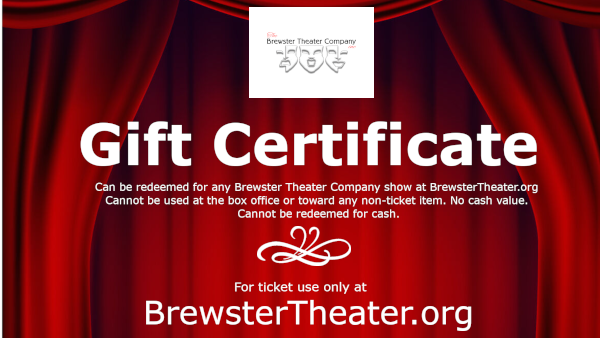 Redeem this gift certificate at checkout for any Brewster Theater Company show. This is an e-Gift Certificate and no physical gift certificate is issued. It is only for tickets and is NOT valid for food, beverage or merchandise. Redeem it when you purchase your tickets. Gift certificate is valid online only